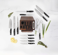 Hemos rediseñado el Royal Prestige® All-in-One Knife Block con madera de acacia naturalmente antibacteriana que además es resistente a la humedad. Preserva la integridad de las hojas de tu colección de cuchillos y almacena hasta 17 utensilios. Aprovecha su afilador integrado para bruñir (realinear el filo) y afilar (reparar por completo el filo) tus cuchillos lisos.